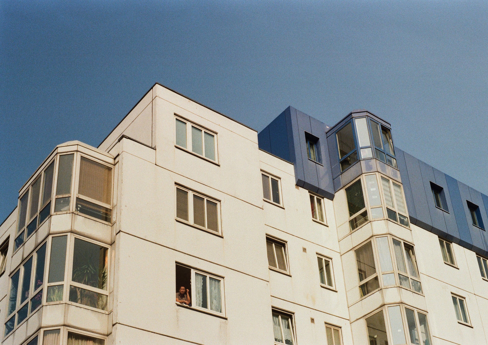 A Room in the Sky captures a quiet tension between solitude and life unfolding. A man stands behind a cream-colored window, high above the street, while balconies hum with hints of daily moments.