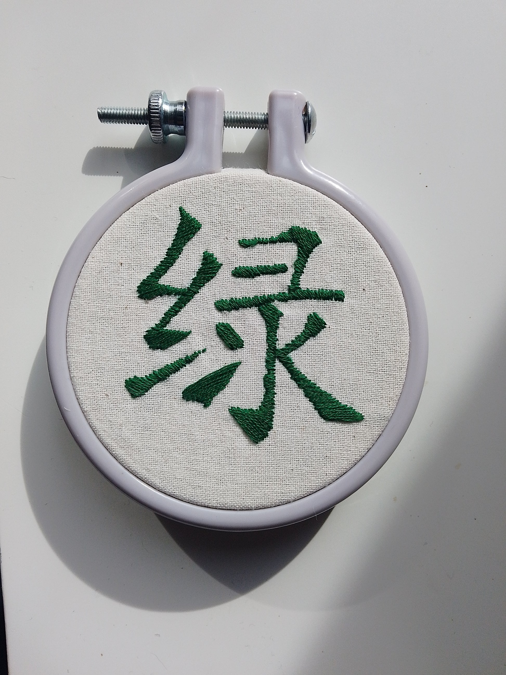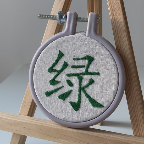 This handmade embroidery features the Chinese character "Lǜ", with means "green".