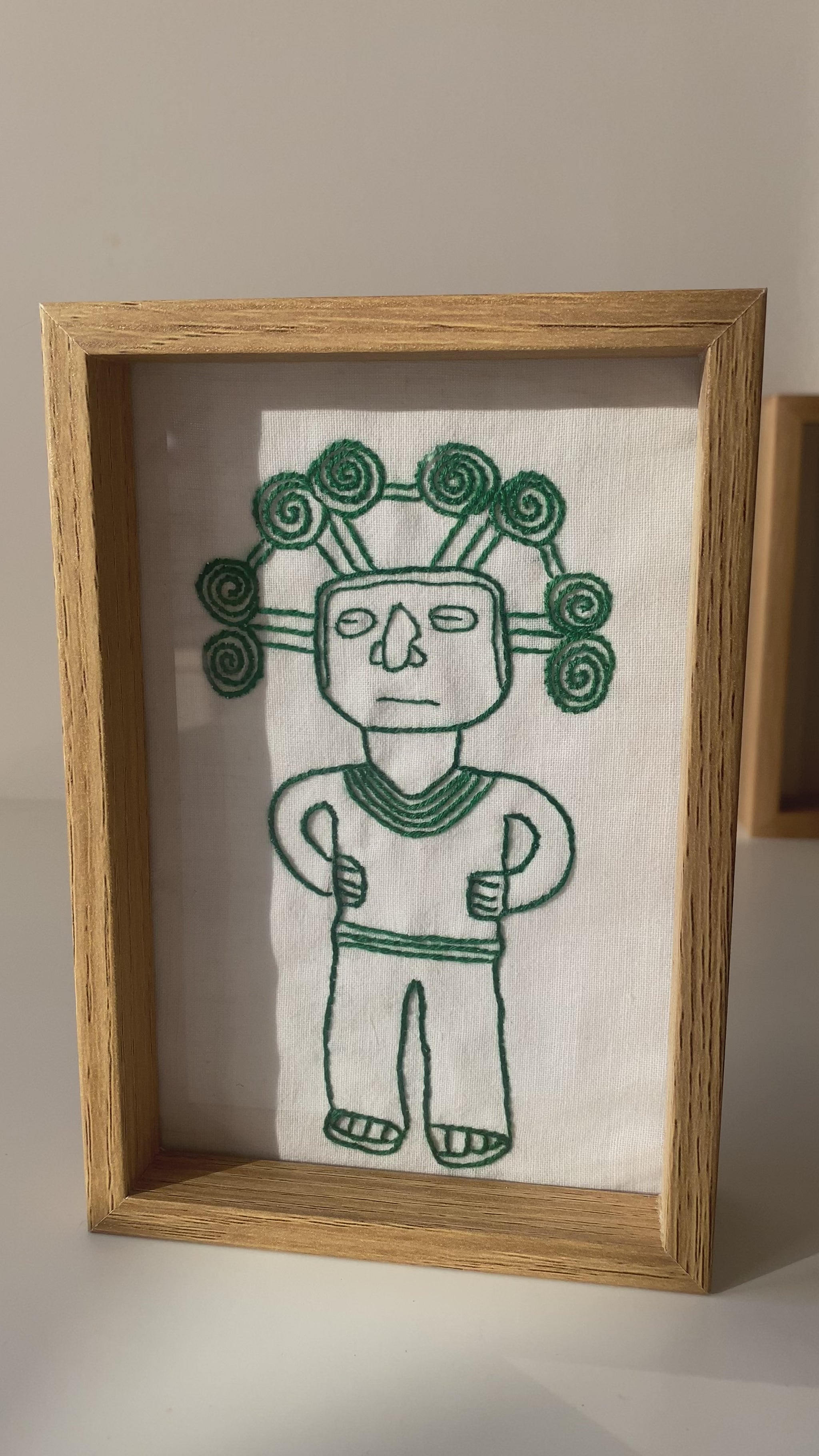 This handmade embroidery invites you to pause and connect with the energy of a pre-colombian triping man.