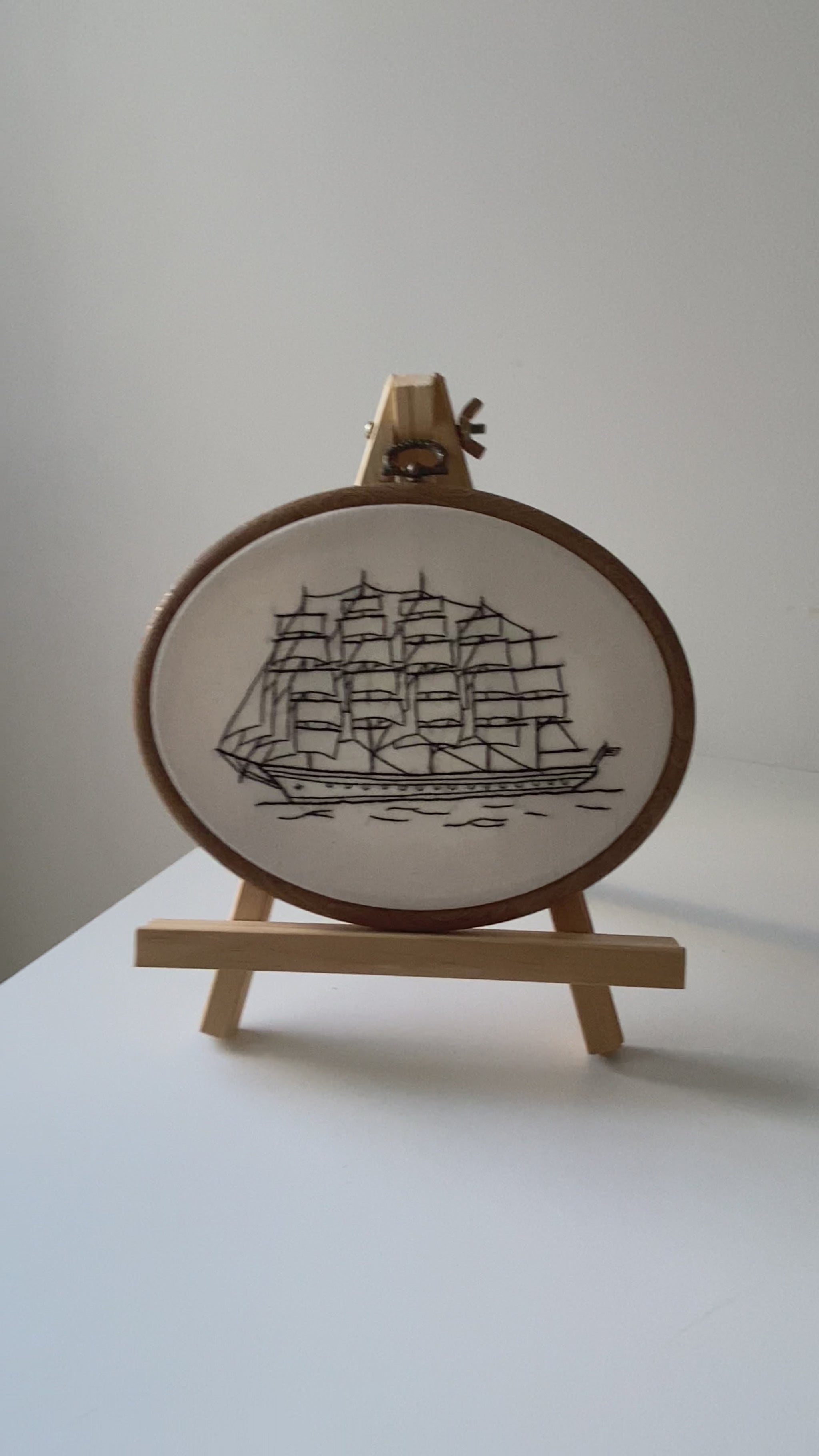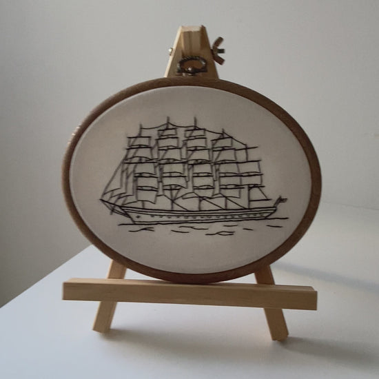 This handmade embroidery celebrates the majestic presence of a five-masted sailboat, inviting reflection on courage, perseverance, and the journeys that shape us.