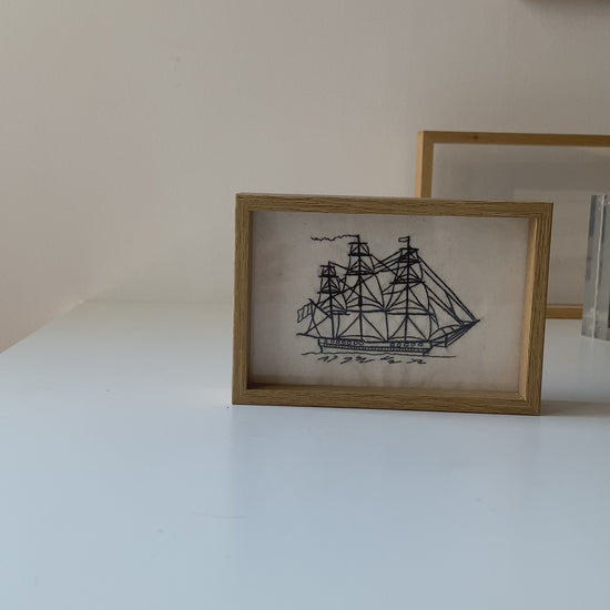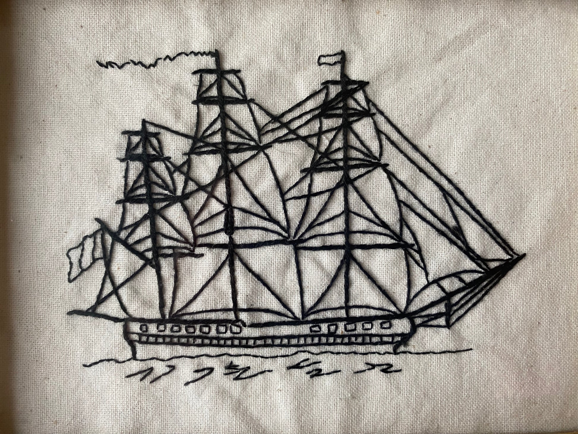 This handmade embroidery captures the quiet strength and enduring beauty of an old three-masted ship — a symbol of courage, discovery, and the stories carried across distant seas.